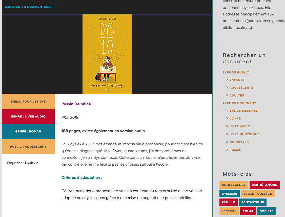 Présentée lors de la journée d’étude « lecture et dyslexie » le 16 octobre 2018 à Landerneau, cette « bibliographie partagée » est un outil simple qui recense des conseils de lecture pour les personnes dyslexiques. Elle s’adresse principalement aux prescripteurs (parents, enseignants, bibliothécaires…).