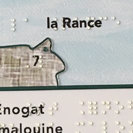 Afin de transcrire la richesse visuelle, tactile, historique, … de ce parcours, nous avons choisi d’utiliser différentes techniques de mise en relief : le thermogonflage (papier gonglant), l’impression en résine et le modelage. Le service Patrimoine de Dinard détient à présent une mallette avec :