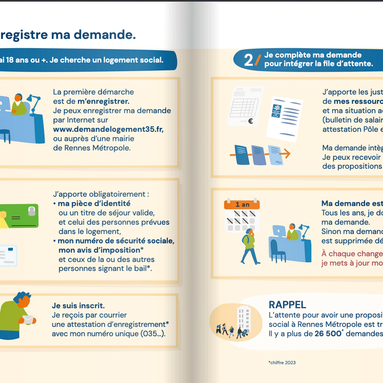 Le service Logement de Rennes Métropole a souhaité refondre le guide « Logement social, Les démarches pour se loger à Rennes Métropole ». Le contexte du logement social à Rennes et sur la métropole est actuellement en forte tension et les démarches sont complexes. L’objectif souhaité est de rendre plus accessible, plus compréhensible ces démarches.
